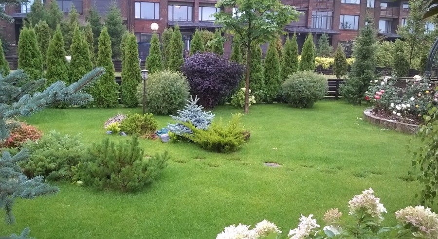 Приветствуется газон, групповые посадки из солитеров, а пестрым цветам тут не место;