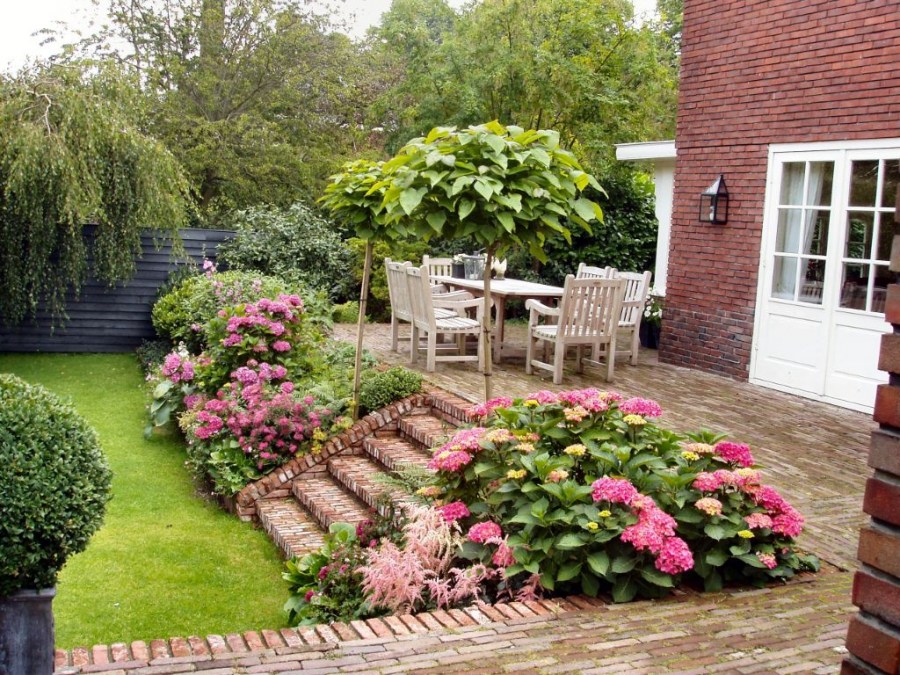 - стиль идеально подойдет для рельефных участков. Если же природных холмов нет, то необходимо будет создать стенки, лестницы и террасированные склоны. Зонировать территорию можно с помощью живых изгородей, а южную часть участка выделить под патио;