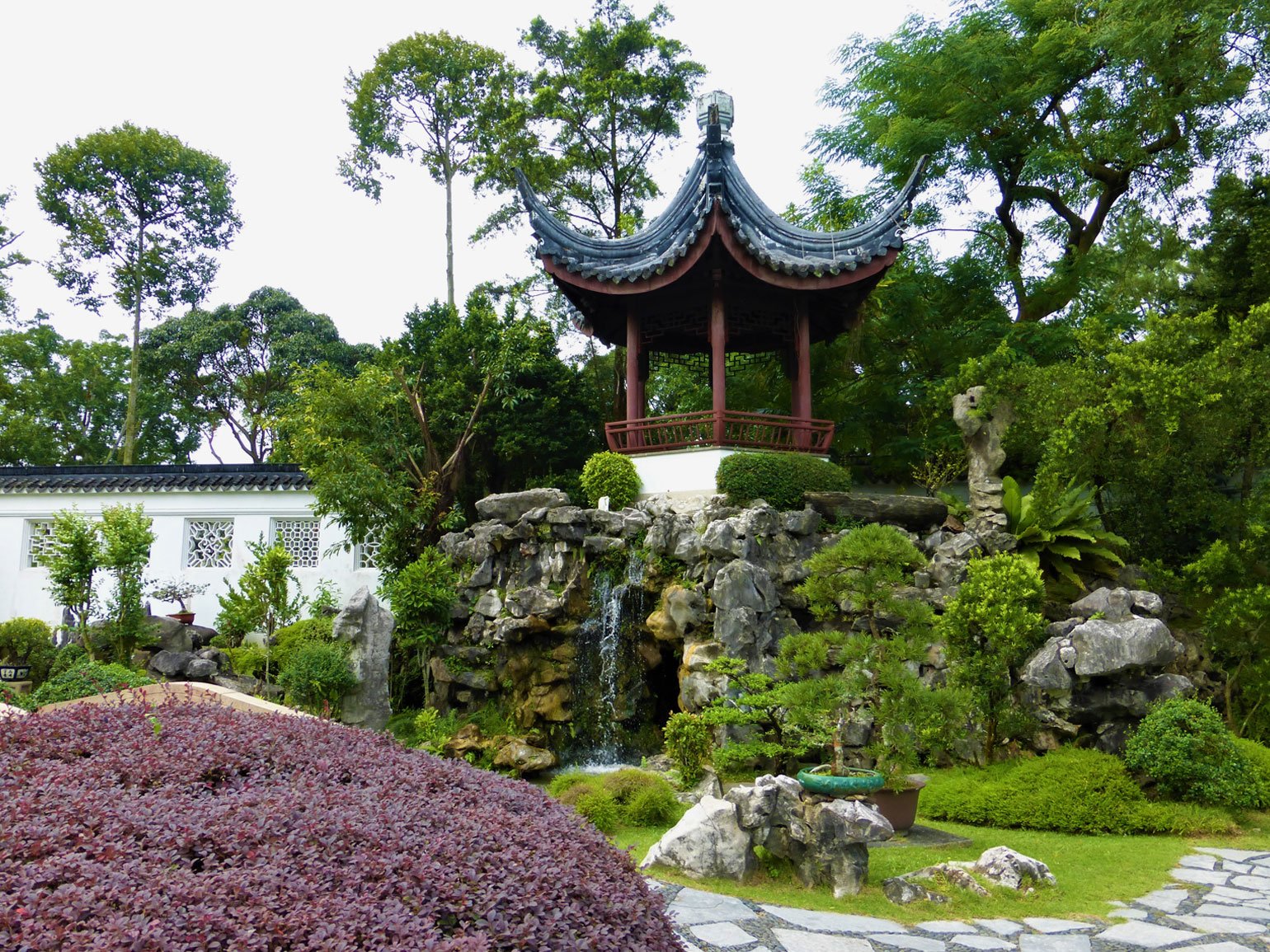 В оригинальном китайском ландшафтном дизайне при выборе растений важна символика. Так, персик знаменует счастье, можжевельник ― здоровье, а жёлтые растения дарят жизненную энергию. Если же сосредоточиться на эстетике, можно выбрать чайные розы, пионы, нарциссы, можжевельники, плодовые кустарники и деревья ― вишню, сливу, а также хвойные деревья.