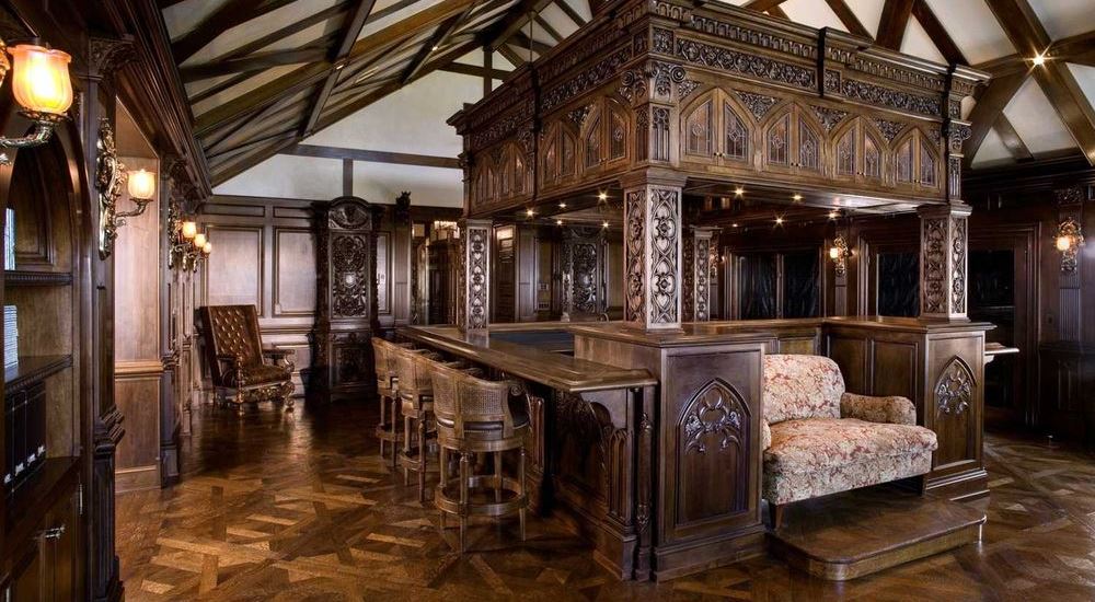 Необходимо тщательно подойти к сочетанию отделки стен и потолка. Идеальным вариантом будет их отделка деревянными панелями или искусственным материалом под камень, окрашенным в темные тона: синий, серый, бордовый или темный фиолетовый. Потолки непременно высокие, сделанные как своды или сымитировать открытые балочные перекрытия. Главная особенность — это стремление вверх.