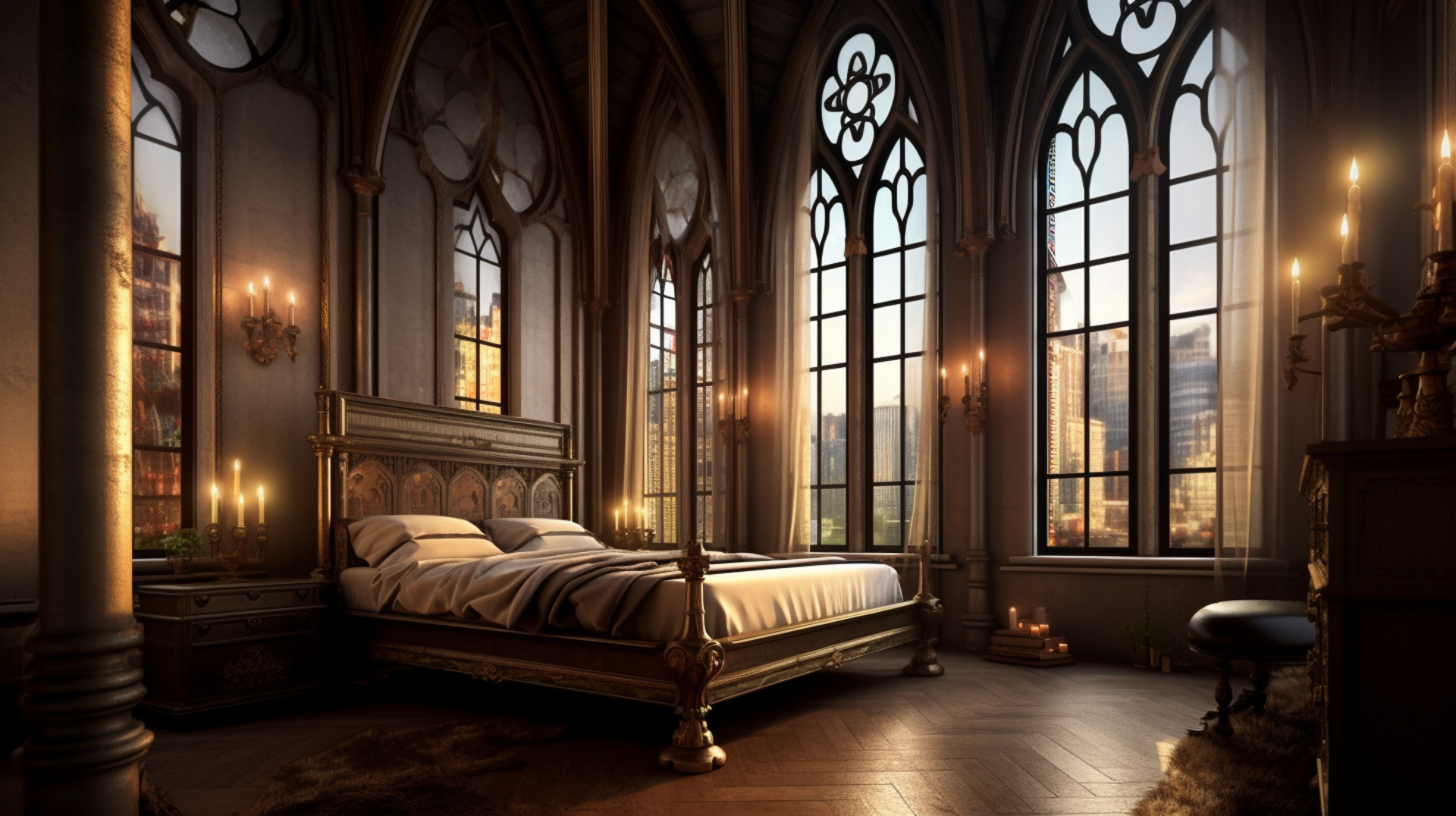 Спальня с дизайном в готическом стиле — это обязательное присутствие массивной мебели из дерева благородных и темных пород: сосна, дуб, кедр или орех, с резными элементами. Это большая кровать с высоким изголовьем, высокий шкаф, комод и прикроватные тумбы в тон к ним. Соответственно, комната должна иметь свободное пространство, расслабляющую и спокойную атмосферу. В готическом стиле спальня иногда может быть обставлена мебелью из кованого металла. Тогда вся комната, напротив, должна быть легкой и воздушной.