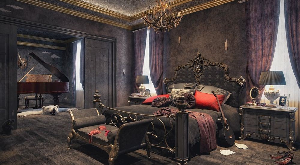 Потолки тоже поддерживают общее настроение. Они либо сводчатые, либо покрыты орнаментом. Спальня девушки в готическом стиле может иметь более мягкую световую гамму и более изящную мебель, но наличие большой кровати с резным изголовьем обязательно.