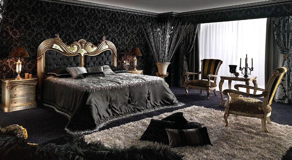 Спальня в готическом стиле создает пышный интерьер, наполненный романтикой и тайной. Она может быть закрыта темными шторами с золотистой вышивкой, стены покрашены темной краской или оклеены обоями с узорами.
