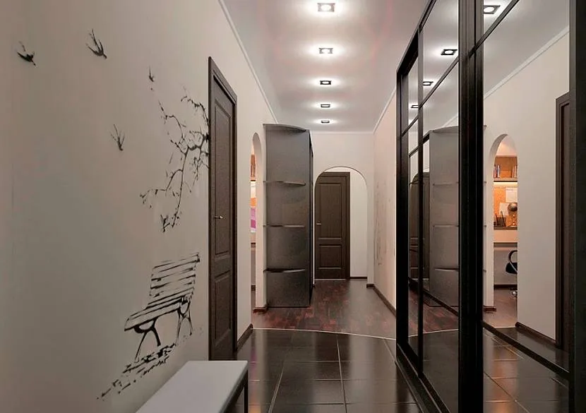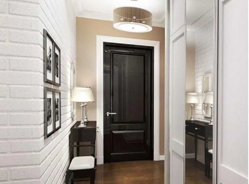 Фактически коридор есть. Но он настолько мал, что в нем с трудом размещается вешалка для одежды и подставка под обувь. Поэтому в таком помещении необходимо акцентироваться на отделке и даже не пытаться установить еще что-нибудь из мебели. Поскольку естественное освещение отсутствует, то рекомендуется остановиться на светлом оформлении с глянцевыми поверхностями и зеркалами.