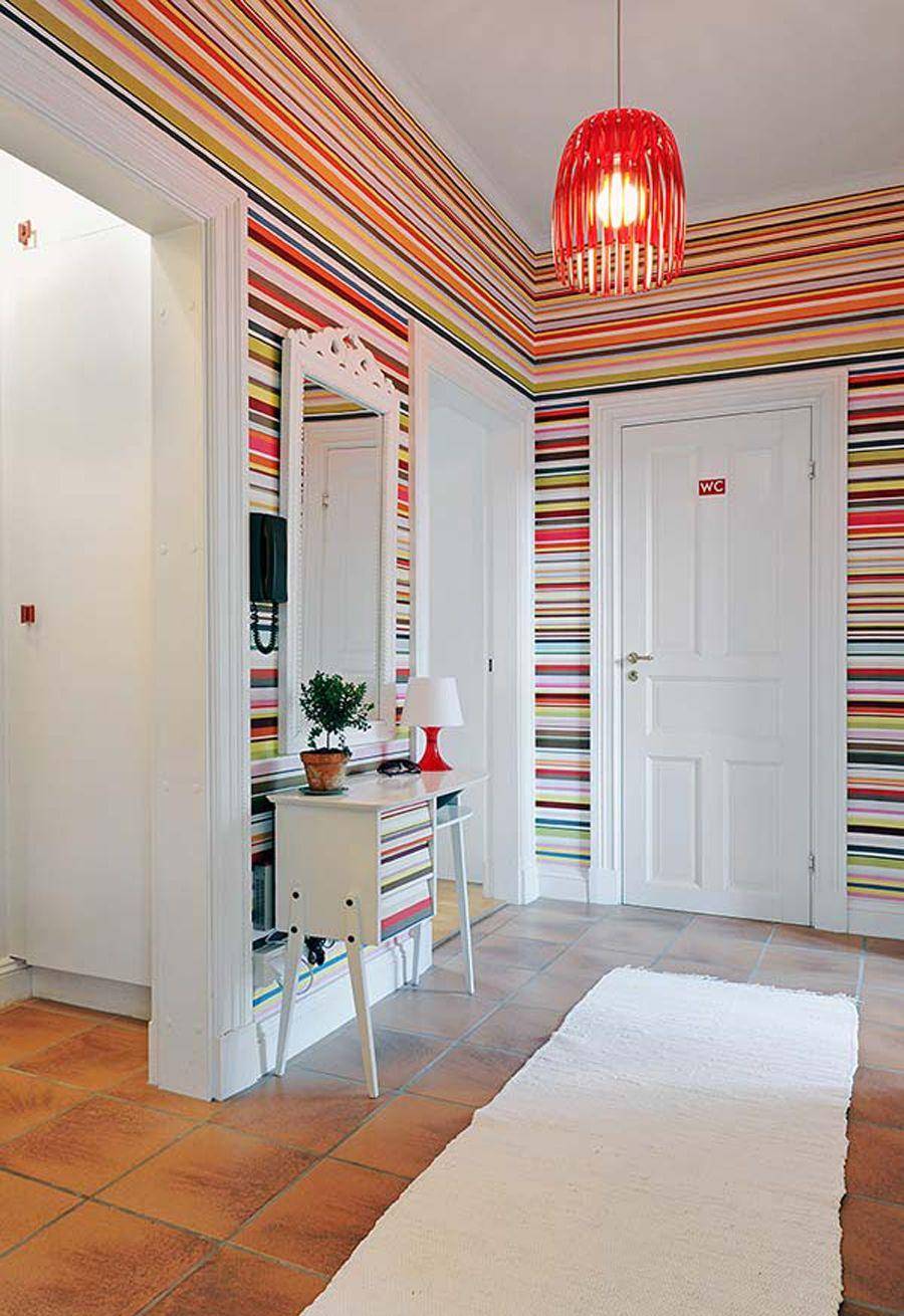 Красная люстра в разноцветной прихожей