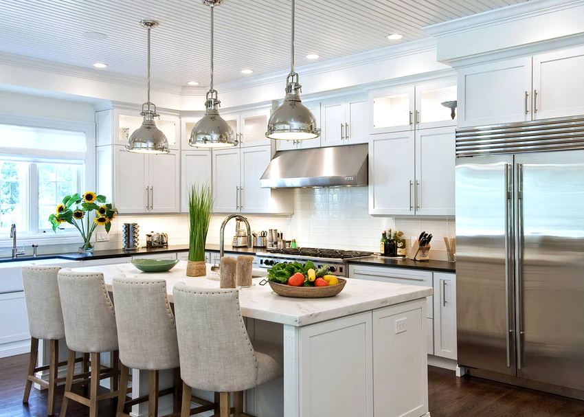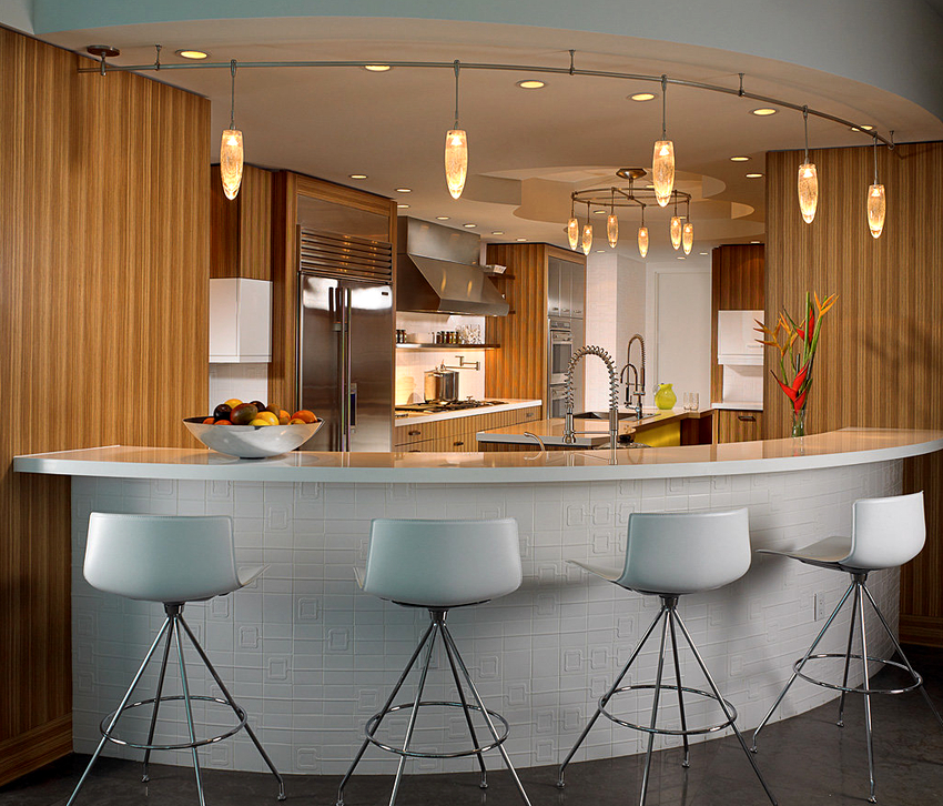 Нужно использовать барные светильники для кухонь, посредством которых будет освещаться стойка. Это обеспечит удобство работы на кухне, и дополнительно разграничит кухонную и жилую зоны.