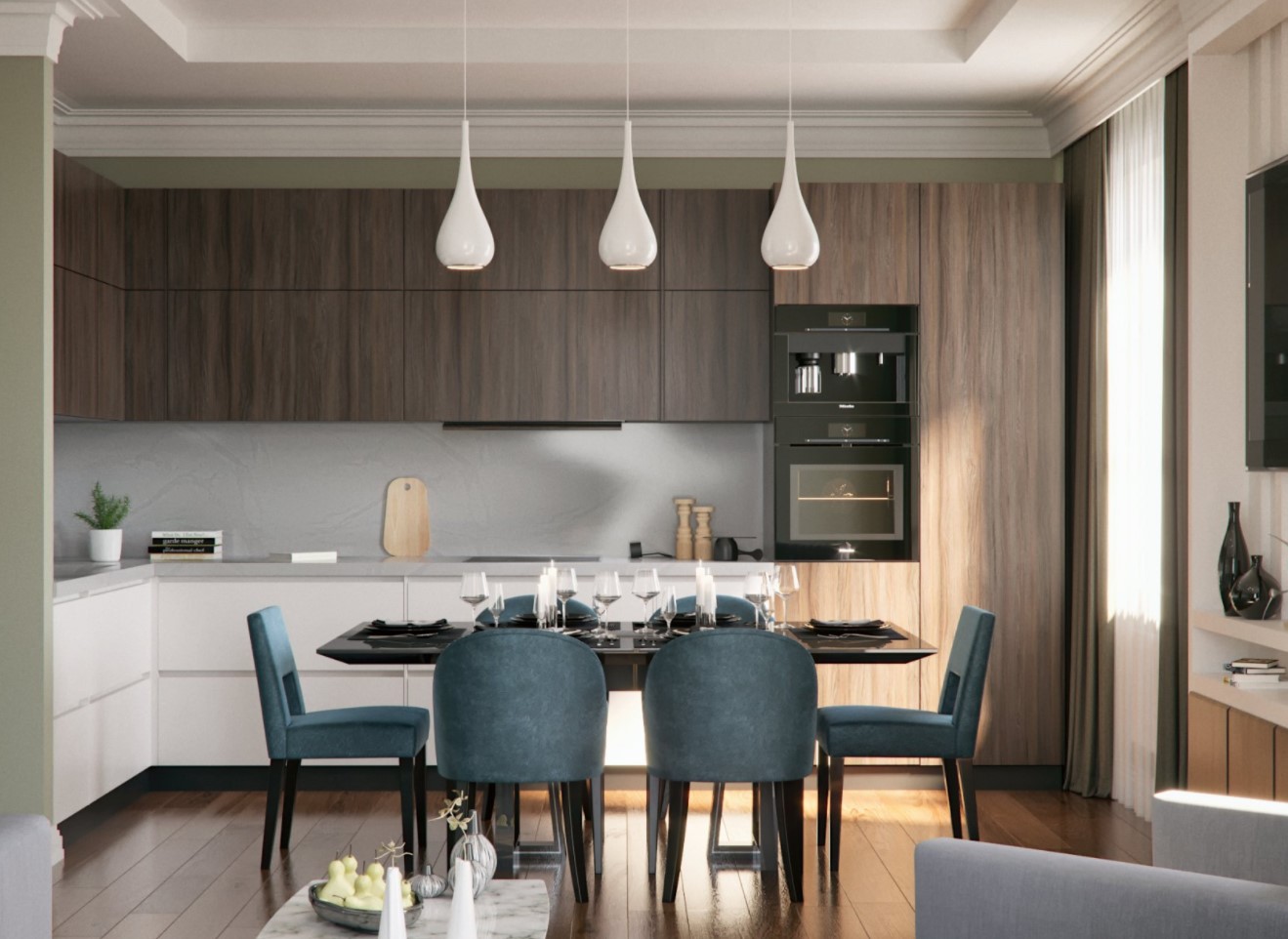 - подчеркнут границы между кухонными зонами.