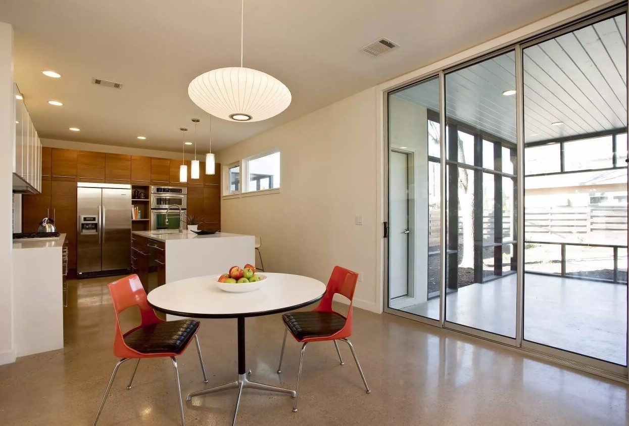 Над обеденной зоной целесообразно расположить подвесной светильник на кухню или организовать плавающее освещение с помощью шинной системы. В качестве дополнительного источника света здесь органично будет выглядеть высокий торшер, который можно поставить сбоку стола.