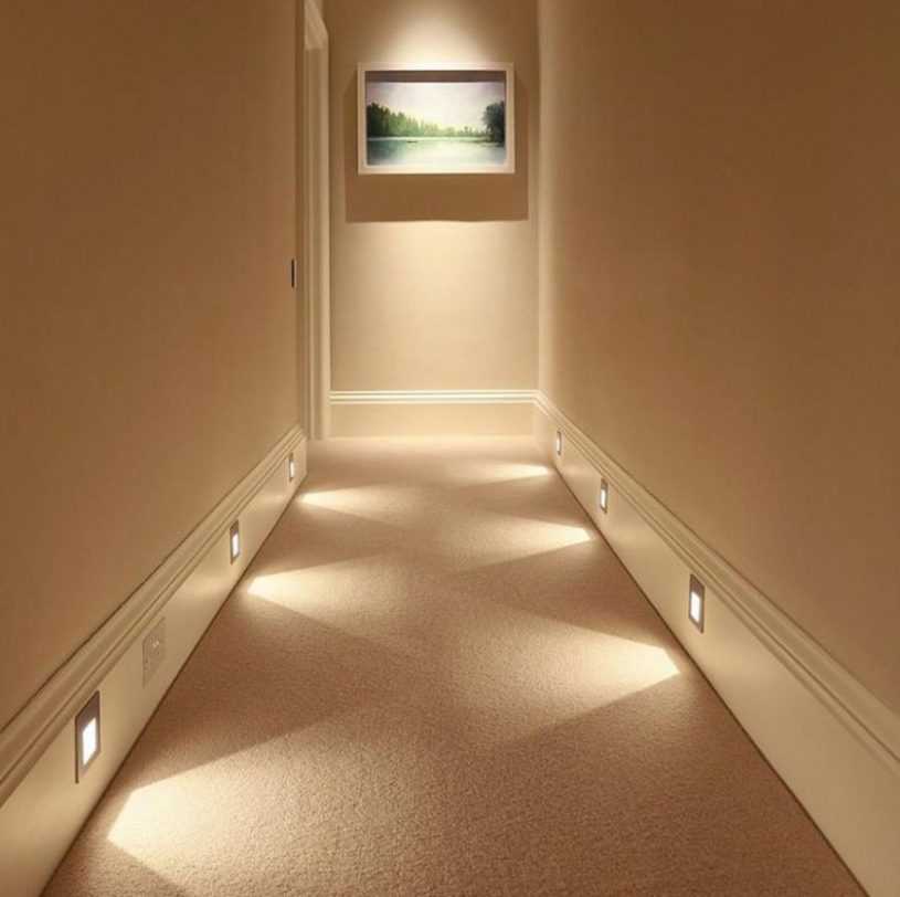 Для подсветки и обозначения направления подойдет светодиодная лента, встроенная в плинтус.