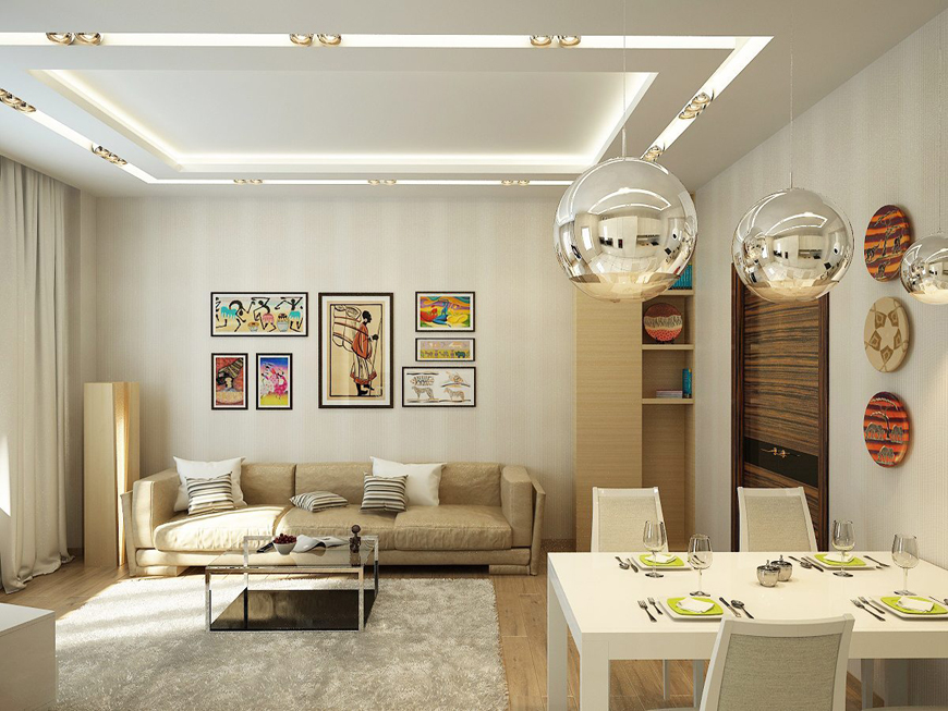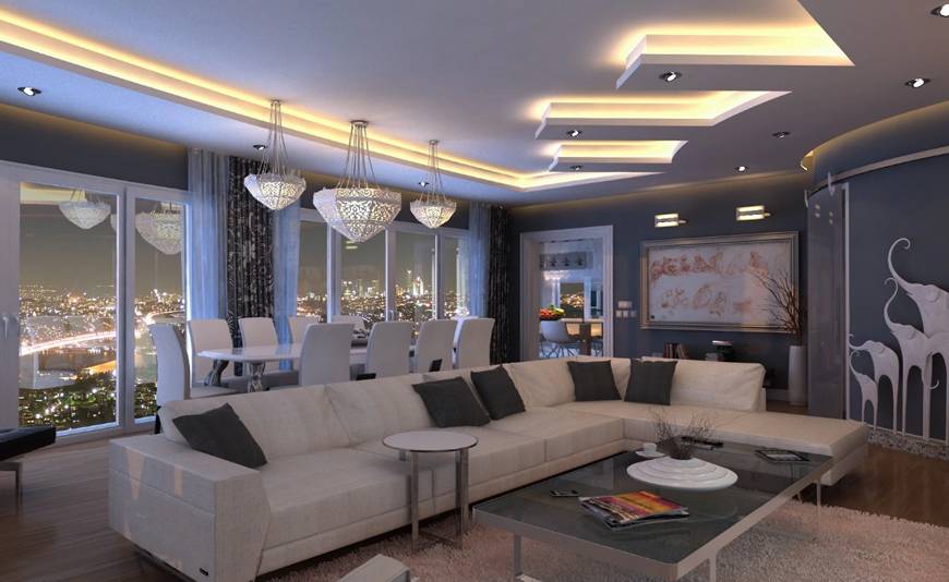 Поскольку именно дизайн гостиной формирует общая впечатление от ремонта, если есть желание сделать скрытую подсветку или потолок нестандартной формы, то имеет смысл реализовать это желание именно тут