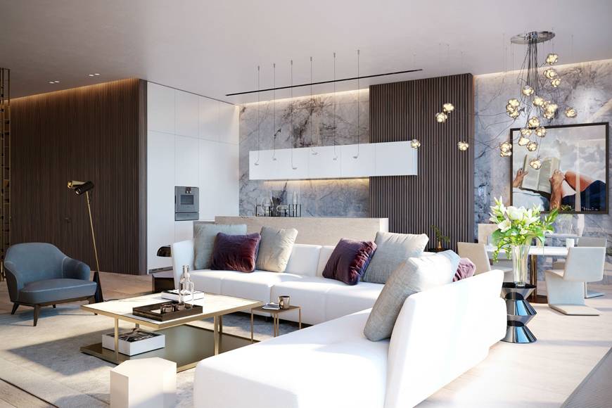 Стало популярным совмещать одновременно кухню и зал вместе, чтобы площадь казалась немного больше. Чаще всего такая планировка предусматривается в квартирах-студиях. Для маленькой гостиной можно создать зонирование между кухней и залом. Массивный светильник, размещенный выше кухонного стола, идеально смотрится. Для общего освещения можно использовать люстру по центру комнаты или точечные споты по периметру.