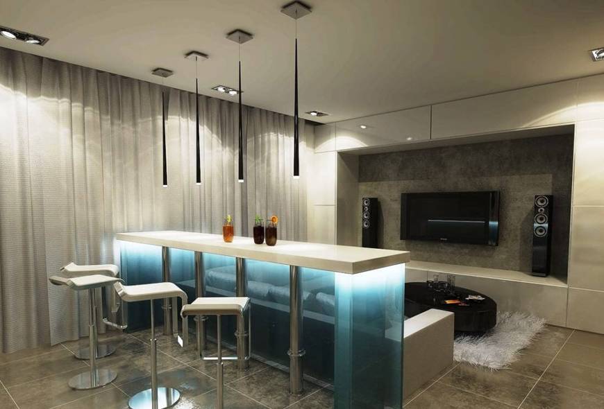 Если в гостиной есть аквариум, стоит продумать его освещение так, чтобы оно несло как практическую, так и декоративную функцию.