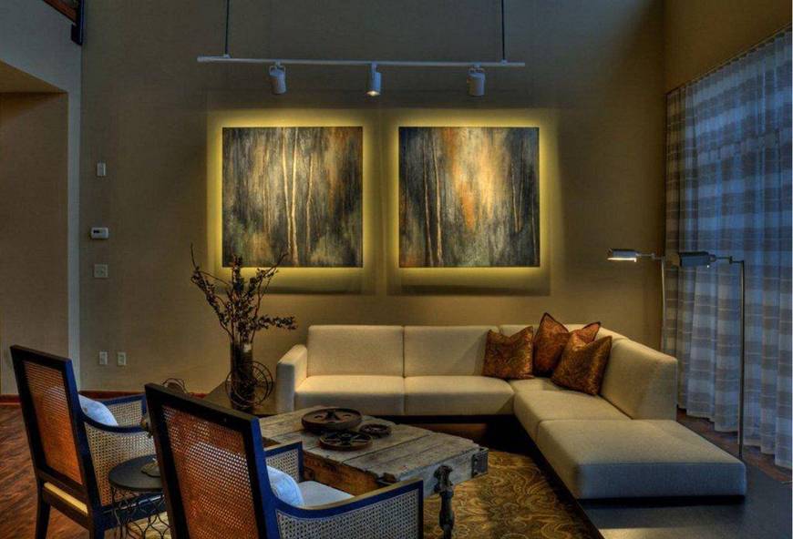 - Если планируете вешать картины, то заранее позаботьтесь об их подсветке.