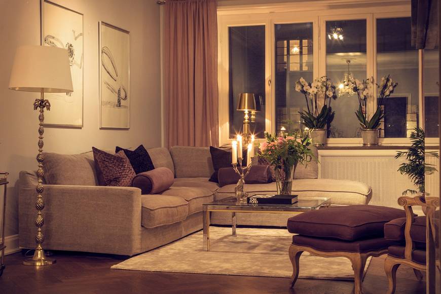 - Освещение, которое подчеркивает и украшает. Правильное освещение будет способствовать созданию ощущения, соответствующего вашему настроению в данный момент. Спокойная атмосфера, ощущение тепла и уюта, интимность или просто расслабление – все это примеры успокаивающей обстановки. Когда вы принимаете гостей, смотрите телевизор, занимаетесь любимым рукоделием или чем-то еще, что требует собственного освещения в гостинной.