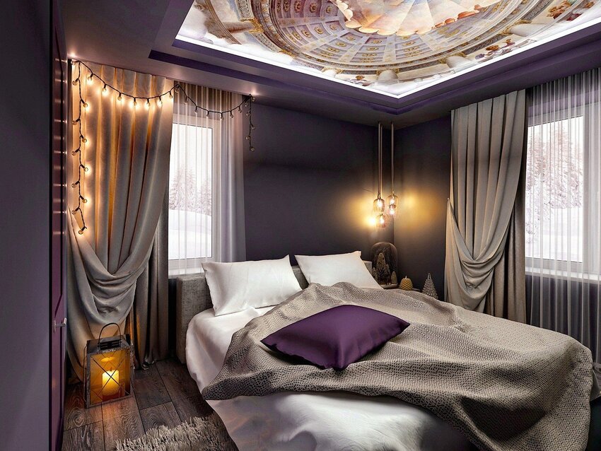 Над кроватью можно разместить необычный балдахин или фигурный навес.
