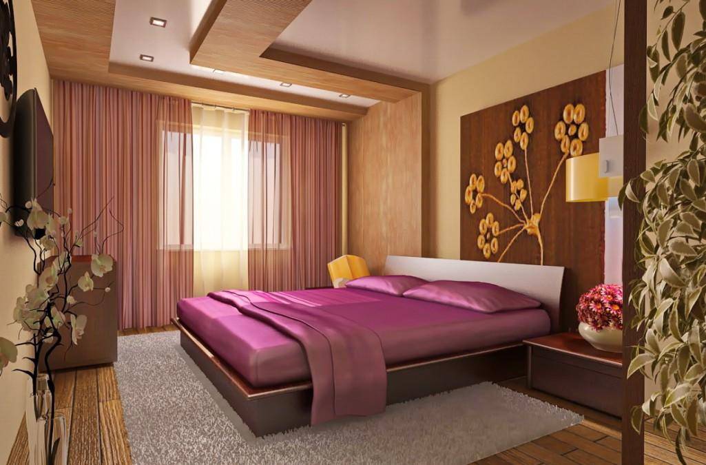 Спальню можно оформить в стремительно набирающем популярность эко-стиле. Для декора используются натуральные материалы: круглые древесные срезы и цельные сухие деревья, вскрытые лаком, живые цветы в горшках, травяные газоны в длинных ящиках.