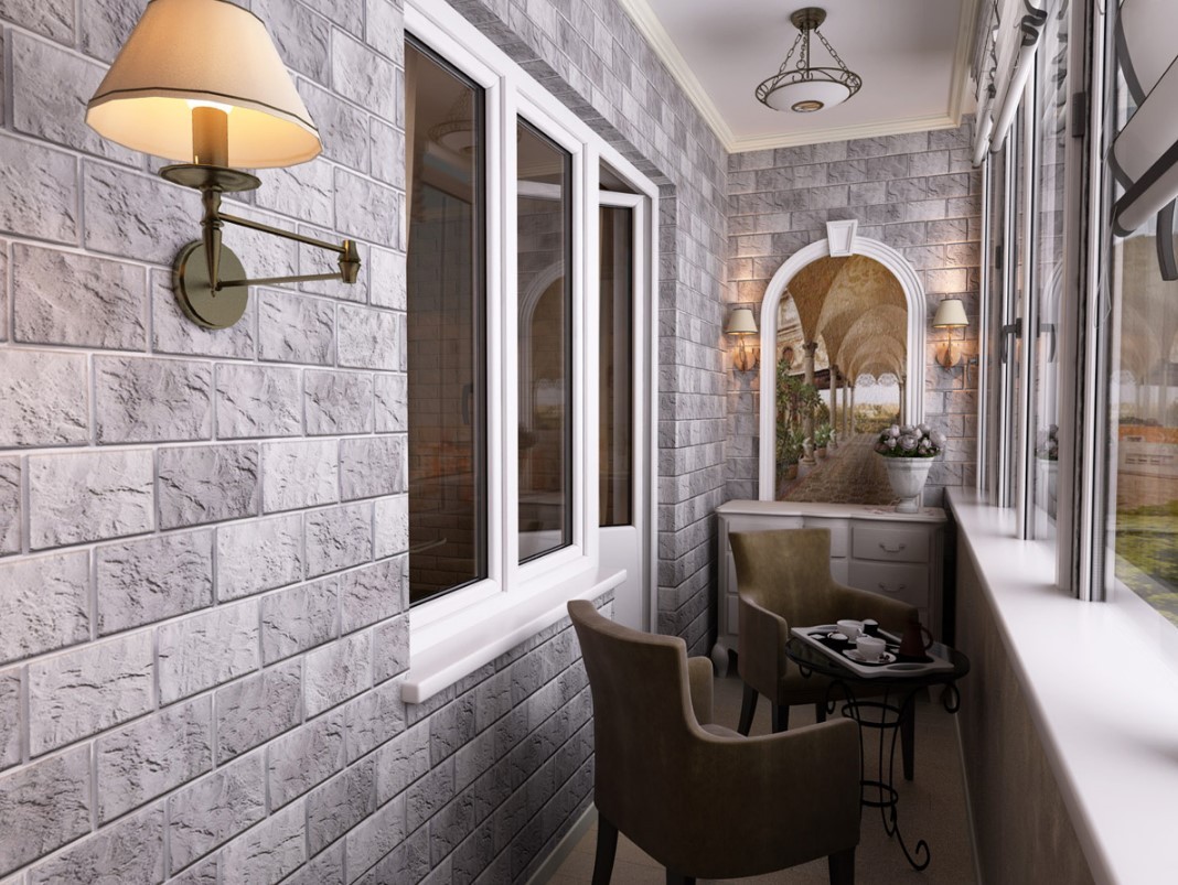 Для отделки балкона внутри применяется искусственный камень из природных материалов: гипса, кварца или современного композитного материала акрила. Для монтажа камня не требуется опыт, так как камень выпускается в прямых и угловых моделях. Имеет несколько десятков цветовых гамм, размеров и фактур. Хорошо сочетается с декоративной штукатуркой. С помощью декоративного камня создаются различные интерьеры, сочетая его с деревом, декоративной штукатуркой и другими материалами.