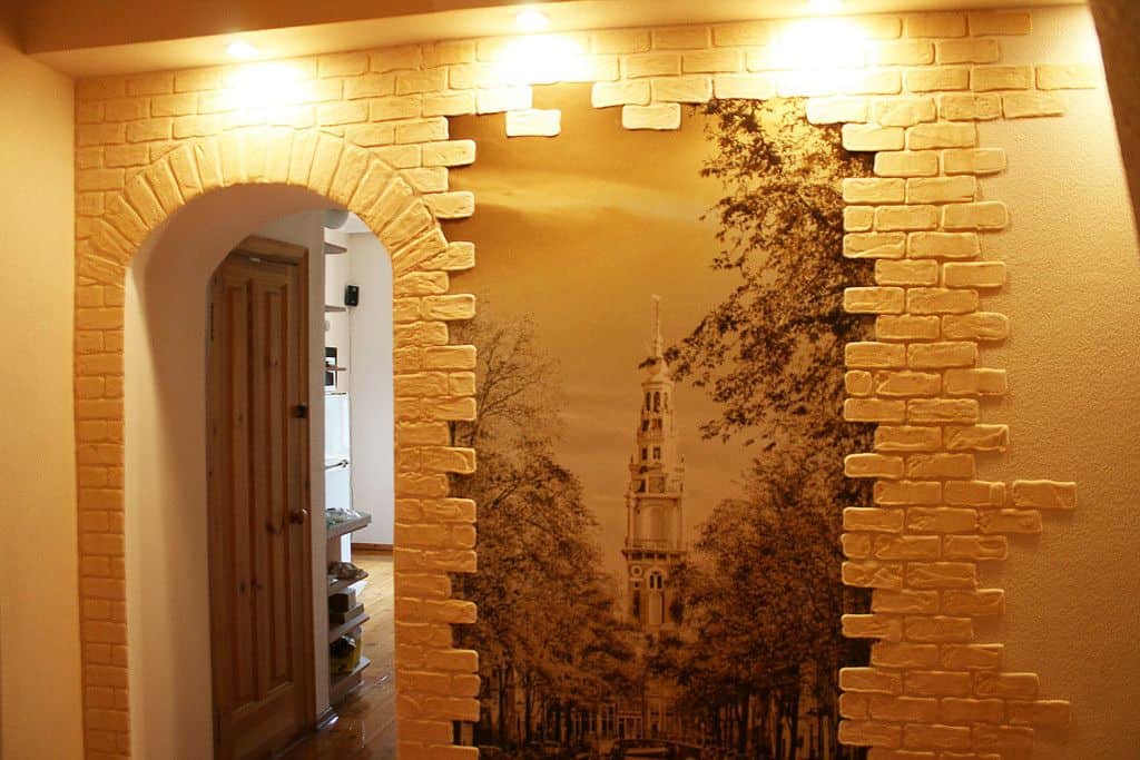«Каменными» обоями можно отделать пространство вокруг входных дверей или арок в помещении. Например, на фоне коридора, отделанного пастельными красками, будет прекрасно смотреться дверной проем, украшенный декоративными полотнами под камень рыжего и кремового оттенка с грубоватыми краями.