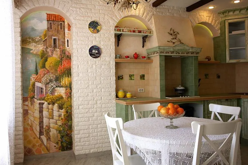 Кухня в стиле прованс красиво облагорожена арочной нишей с художественным наполнением, отделана побелкой по декоративному камнюИсточник design-homes.ru