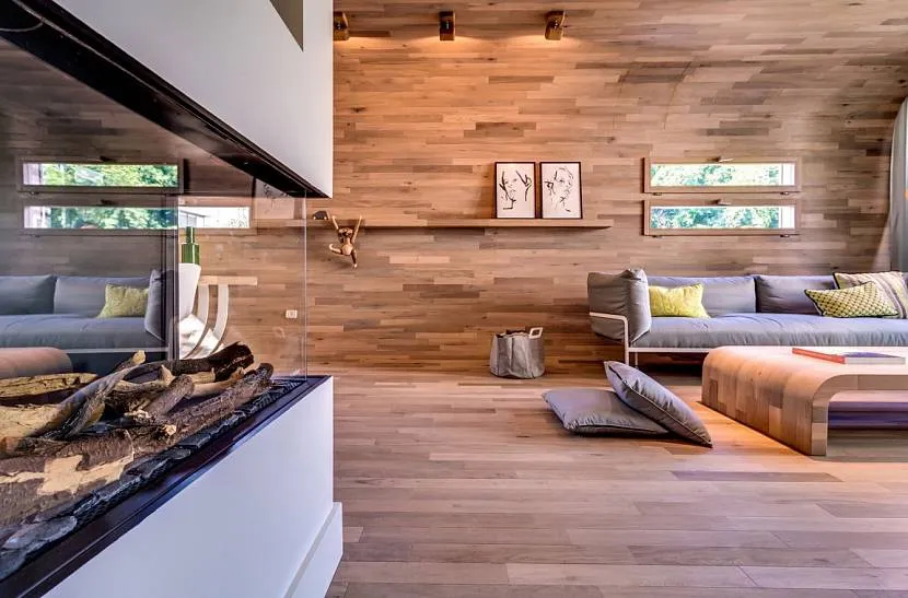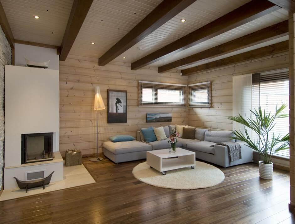 Покрытые деревом стены, пол и потолки уместны в высоких помещениях с большими окнами, а количество мебели при этом должно быть минимальным, например: мягкий уголок, маленький столик и ковер светлых оттенков.