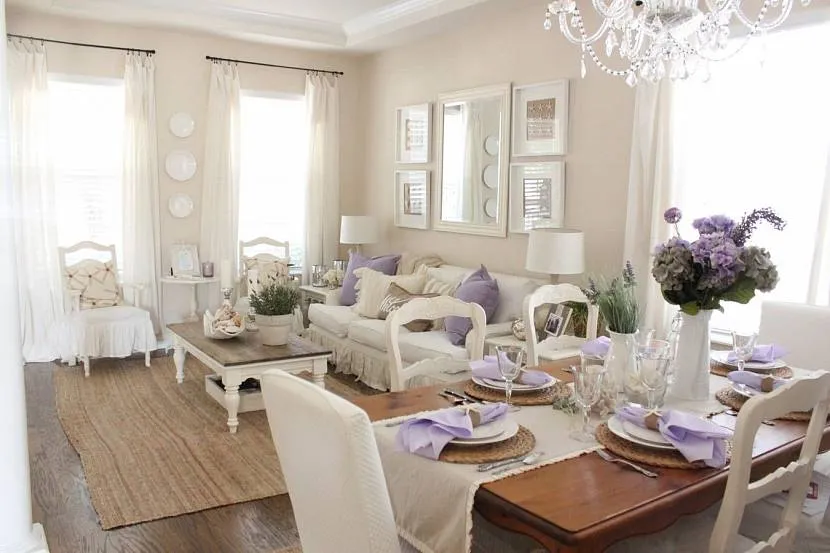Деревенский стиль привносит в зал ощущение домашнего уюта. Для интерьера характерны побеленные стены, фасады мебели и пастельные цвета (лаванда, роза) в декоре. Нарочитую небрежность отделки легко скрыть под светлыми оттенками. Чтобы комната не выглядела обезличенной, используют акценты в украшениях.