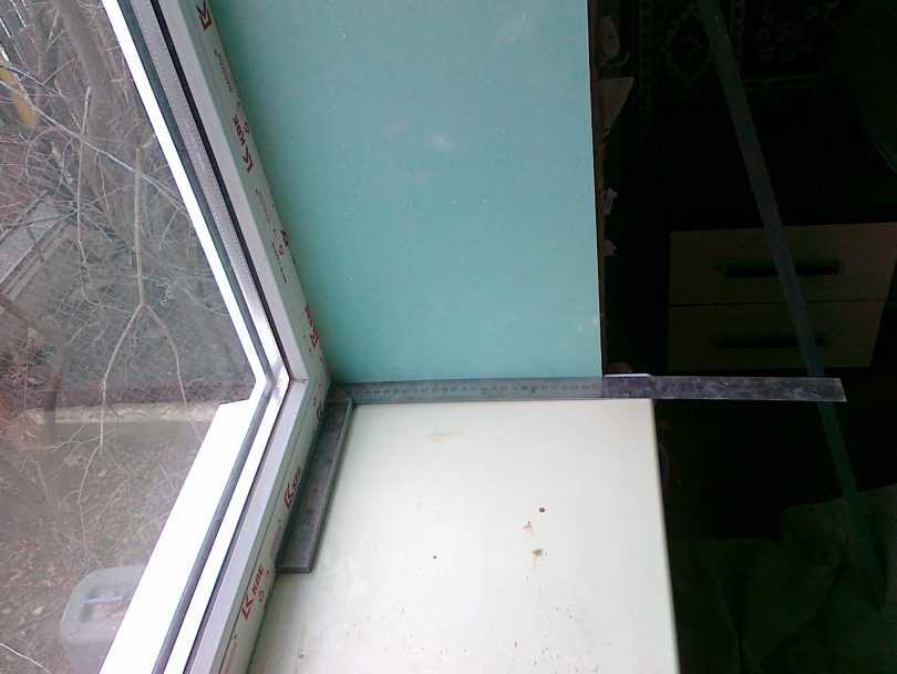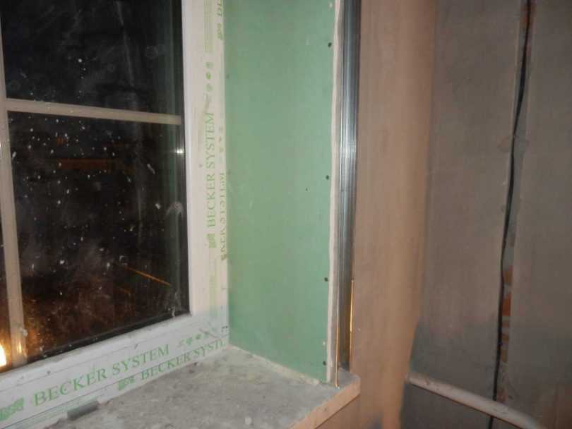 Расстояние между окном и откосом прокладывают слоем минеральной ваты, на ближний края наносят слой клея, и с использованием уровня осторожно прижимают лист гипсокартона к стене
