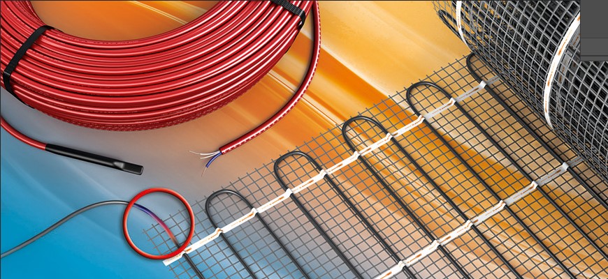 Конструкция состоит из провода с токопроводящими жилами. Она преобразует электрическую энергию в тепло. Для изменения уровня нагрева устанавливают терморегулятор. Скрытый в стяжке или штробе кабель укладывают с нужным шагом. Уровень пола при обустройстве такой конструкции повышается на 3 см.