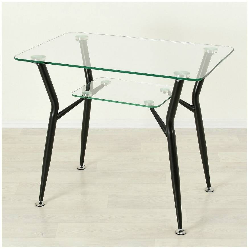 Квадро 10 – стол стандартной конструкции для небольшой кухни, оснащённый стеклянной столешницей прямоугольной формы с небольшой полкой, устанавливаемый на прочные стальные ножки. Имеет стильный привлекательный дизайн, благодаря чему будет смотреться очень лаконично и гармонично на фоне другой кухонной мебели. Размер столешницы составляет 70х60 см, а толщина – 10 мм. Для исключения травм в процессе эксплуатации её углы скруглены. Торцевые части имеют такую форму, которая не позволяет порезаться стеклом в повседневной жизни. Под столешницей расположена стеклянная полка с меньшими размерами, но такой же формы, сделана также из стекла. Ножки сделаны из стали с нанесением хромированного защитно-декоративного слоя. Их высота составляет 75 см, поэтому размещаться за столом будет удобно и взрослым, и детям. В нижней части ножек установлены опоры с защитными проставками и регулировочными винтами для подстройки надёжного и устойчивого положения на любых типах напольных покрытий. Масса стола всего 17,5 кг.
