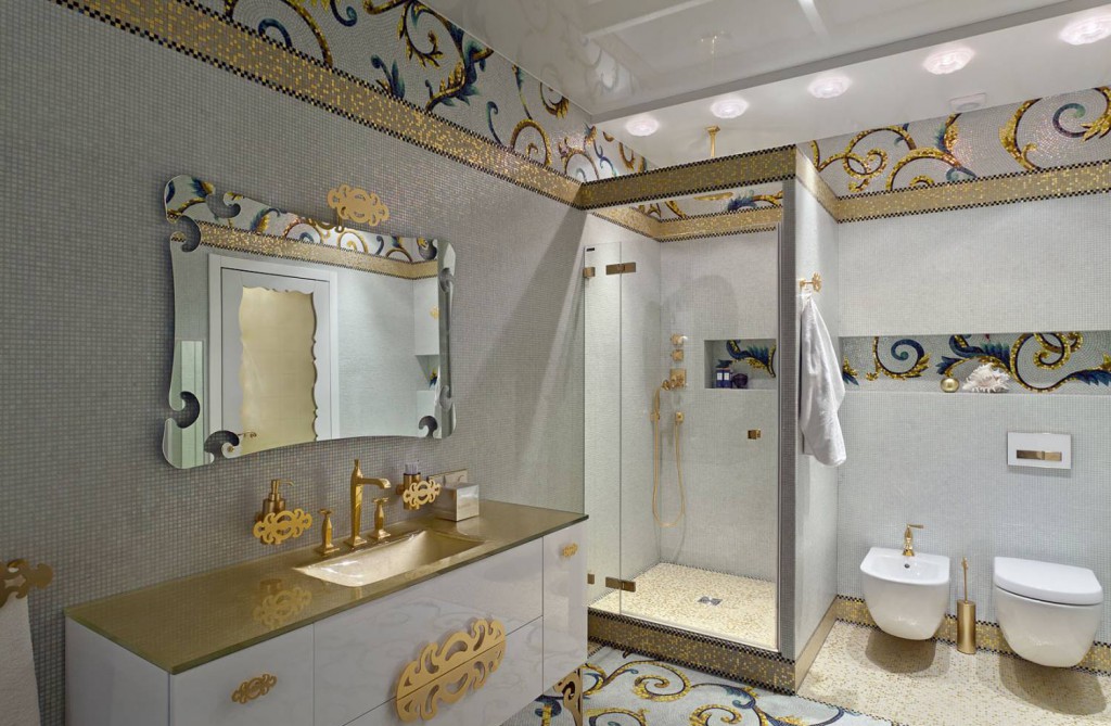 Если санузел не совмещенный, то дизайн для ванны с мозаикой, рекомендуется разбивать на зоны, подбирая панно
