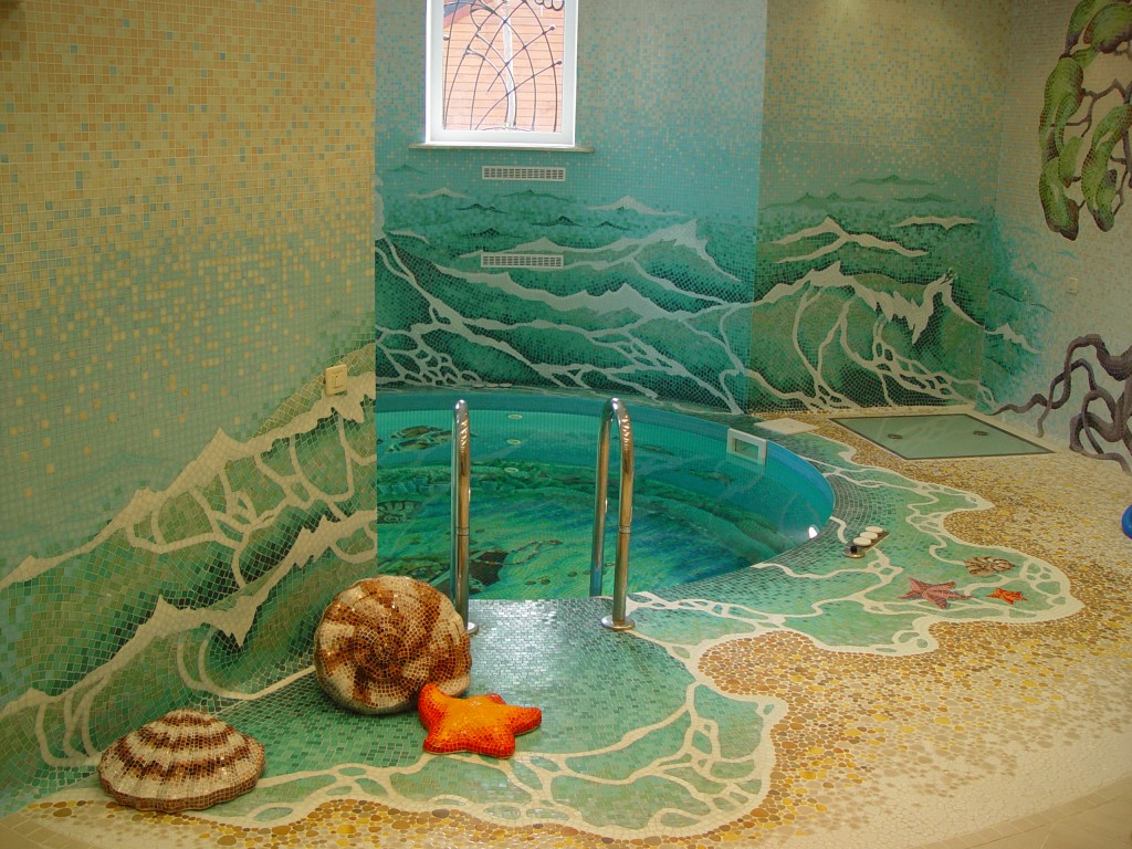 Владельцы больших комнат пользуются некоторыми рекомендациями по поводу того, что скромничать с масштабами не стоит. Можно придумать что-то необычное, к примеру, всю стену выложить мозаикой. На мозаичном панно могут быть изображены дельфины, корабли, морские пейзажи, живая природа.