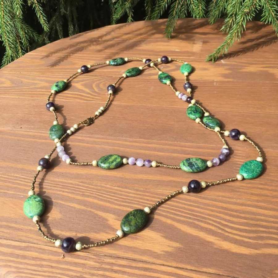Для бус подойдут камушки по-меньше. Чтобы они не соскальзывали с нити-основы, по бокам каждого из них лучше завязать узелок. В бусах хорошо смотрятся камни разного цвета и размера.