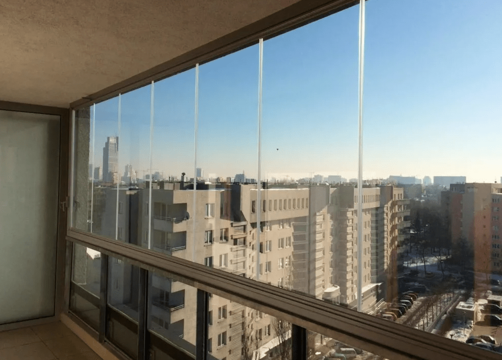 Специальные закаленные стекла крепятся на роликовые направляющие сверху и снизу, затем закрепляются между собой и по бокам. Створки открываются по направлению внутрь балкона или же сдвигаются «гармошкой».