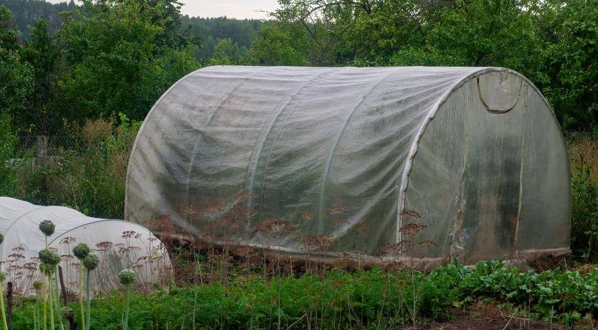 Самый простой и бюджетный вариант создания уютного и теплого дома для растений прослужит пару лет, после чего его придется менять. Недостатком служит и необходимость демонтажа пленки перед началом проливных дождей и похолодания. Пленку придется дополнительно укреплять на каркасе, в противном случае она просто сложится от сильного ветра, при этом протыкать материал настоятельно не рекомендуется.