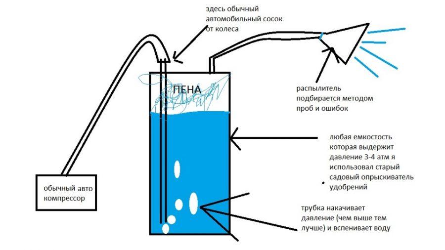 Наглядная схема сборки такого пеногенератора представлена на рисунке. Если все элементы соединены в правильном порядке, такое устройство вполне сможет справляться со своей функцией и с легкостью заменит дорогостоящее оборудование заводского производства.