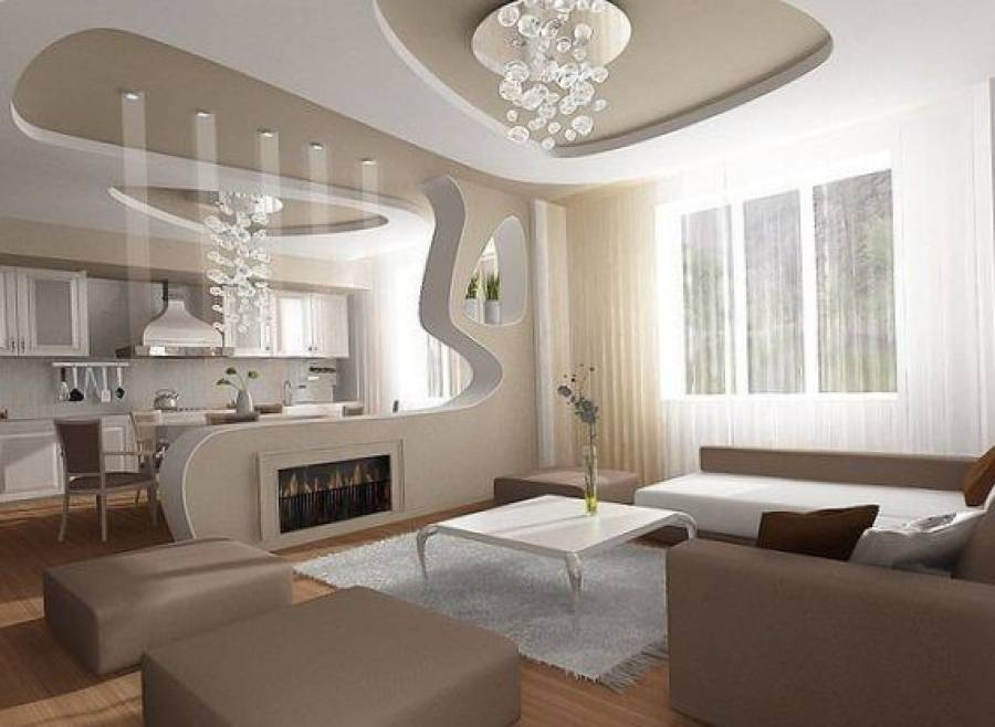 Более органично будет выглядеть комната с единым покрытием, разделённым на зоны перегородками и светом.