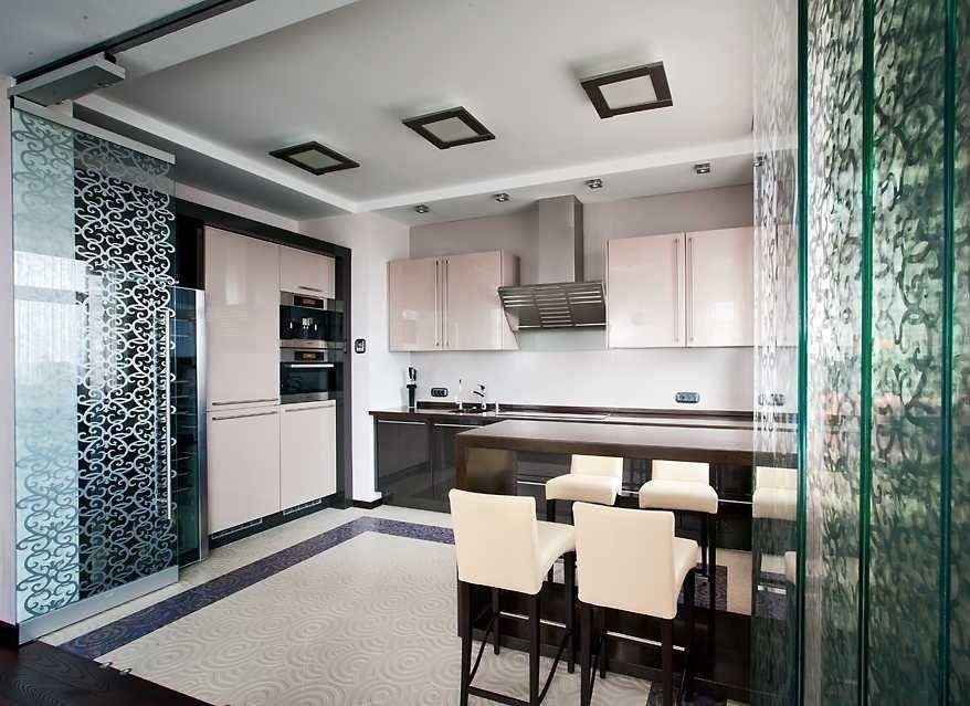 Выбор конструкции осуществляется с учетом многих факторов. Самым важным выступает площадь. Так, при небольших размерах пространство функциональную не устанавливают, так как она занимает много места. На фото – перегородки между кухней и гостиной.