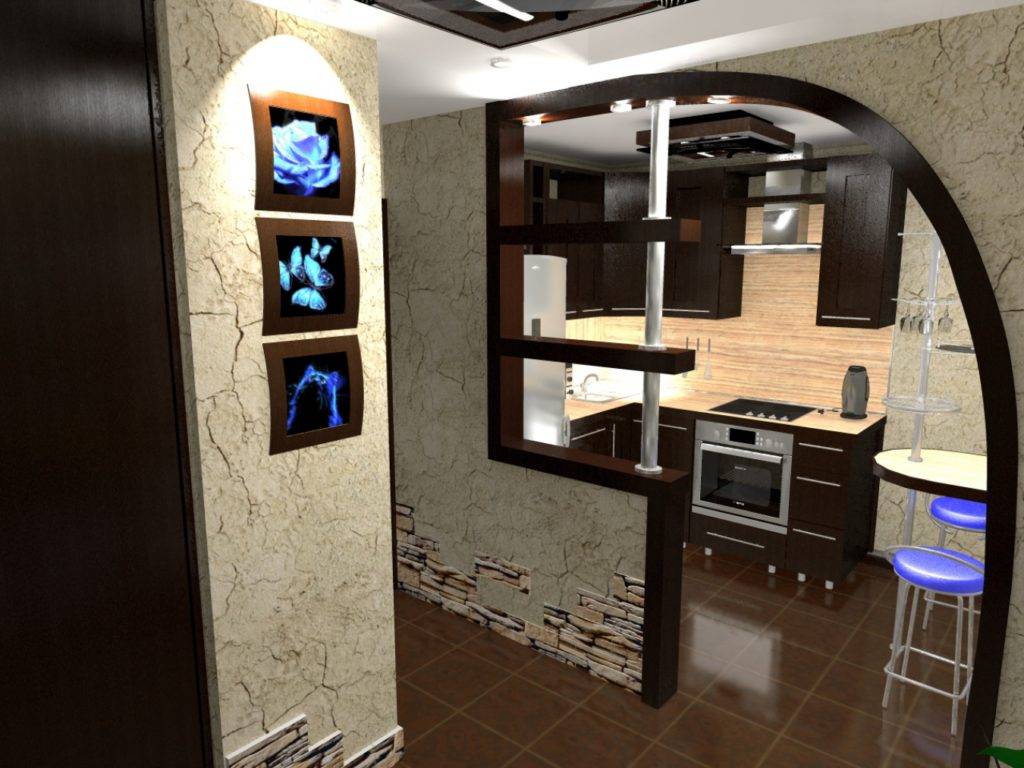 Зрительно отделить кухню от прихожей можно гипсокартонной конструкцией – колоннами или аркой. Стеклянная раздвижная перегородка или барная стойка – еще один способ разграничить пространство, не используя глухих стен.