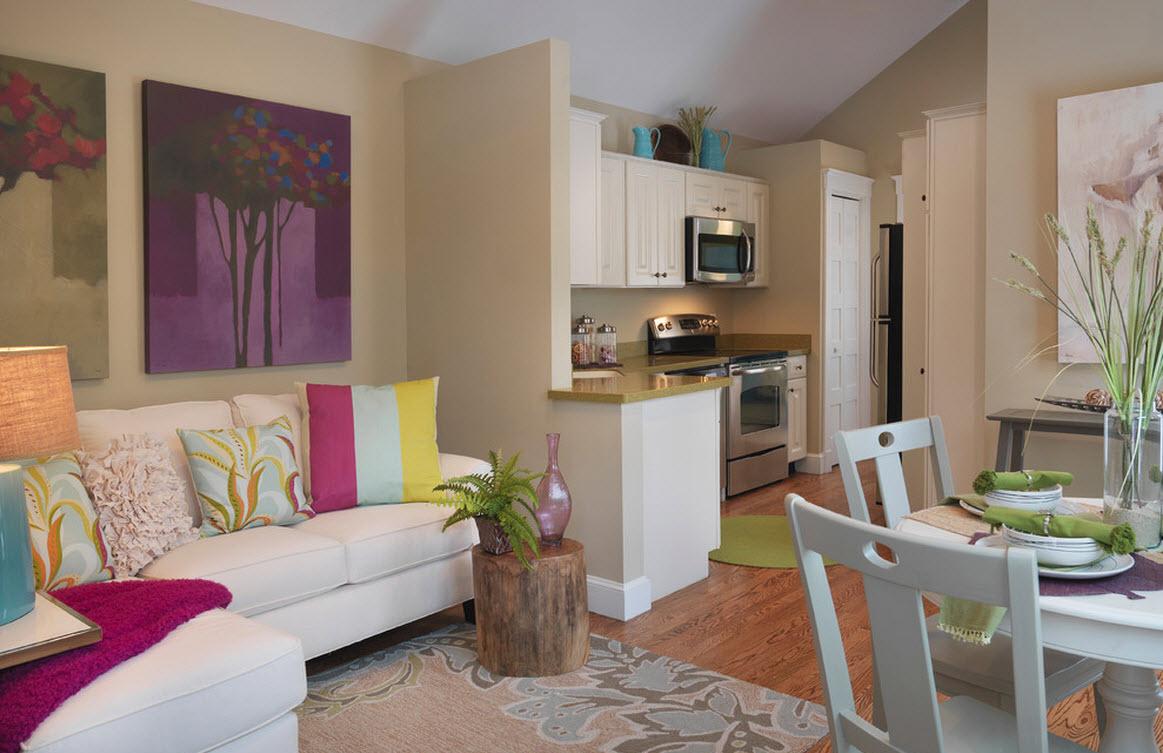 Оригинальный способ зонирования текстилем позволяет легко менять атмосферу кухни и гостиной. Цвет занавесок должен гармонировать с оттенками мебели, сочетаться с отделкой.