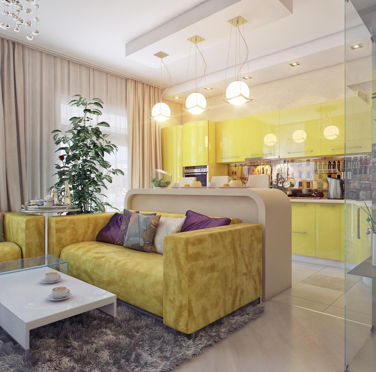 Чем меньше площадь студии, тем меньше она нуждается в какой-либо перегородке, отгораживающей зону кухни. Иначе визуально квартира будет выглядеть совсем крохотной. Зонирование подчеркивают выступающей барной стойкой, стеллажами, фальшбалками и другими способами.