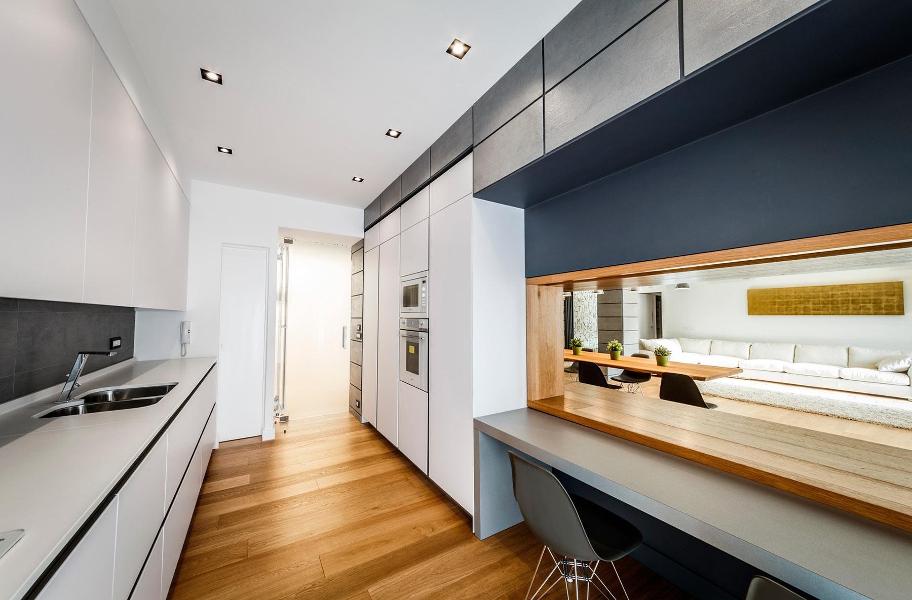На фото раздвижная перегородка, разделяющая небольшую кухню и гостиную.