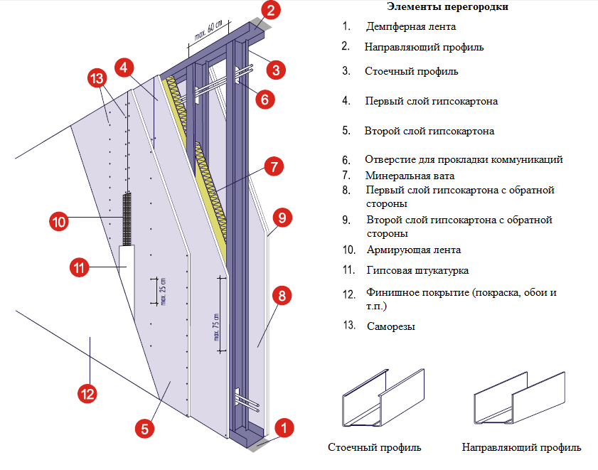 Рисунок 1. Конструктивные элементы перегородки из ГКЛ