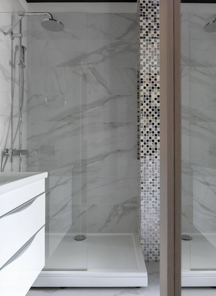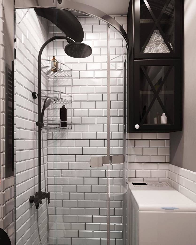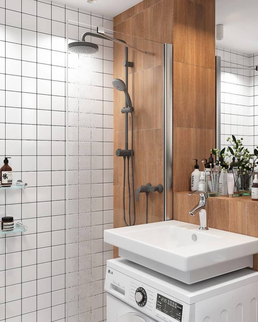 За счет этого дизайнерского шага можно сэкономить несколько квадратных метров площади, куда поместится стиральная машинка или корзина для белья
