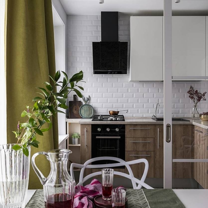 2. Маленькая кухня. Идеальное решение — объединить с гостиной: тогда и место для столовой найдется, и помещение не будет казаться столь тесным. Но по закону газоснабжение — препятствие к отказу от перегородки между зонами кухни и гостиной. Как быть: