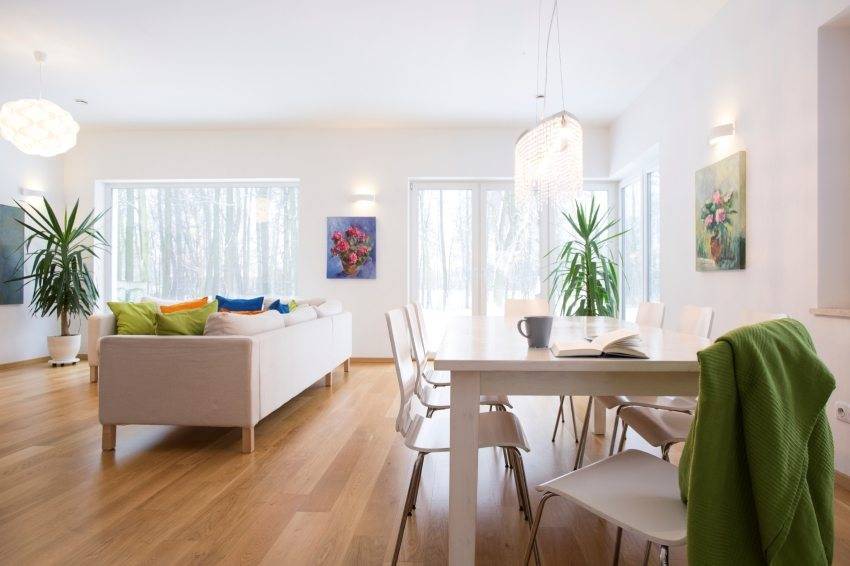 Совмещение кухни и гостиной позволило получить просторную обеденную зону