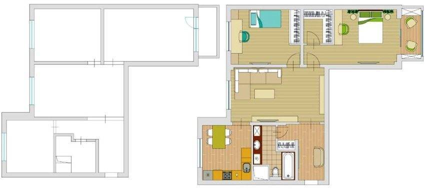 Пример перепланировки двухкомнатной квартиры 60 кв.м в трехкомнатную