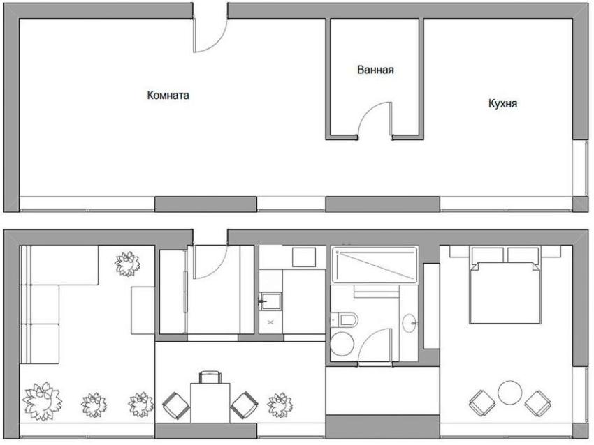 Как ни удивительно, но возможно сделать и перепланировку однокомнатной квартиры. Фото удачных решений доказывают целесообразность таких вложений. Вариантов перепланировки однокомнатной квартиры достаточно много, и все они направлены на визуальное и фактическое расширение пространства.