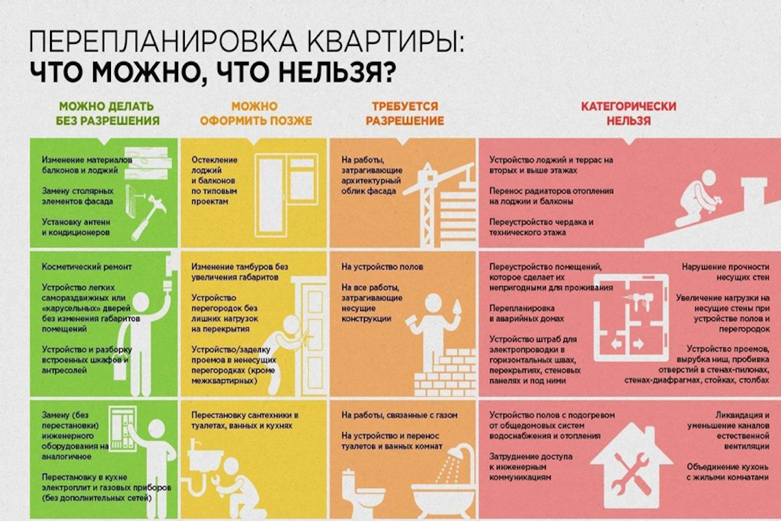Итак, перепланировка квартиры — что можно, а что нельзя? В начале о том, какая перепланировка квартиры не требует разрешения?