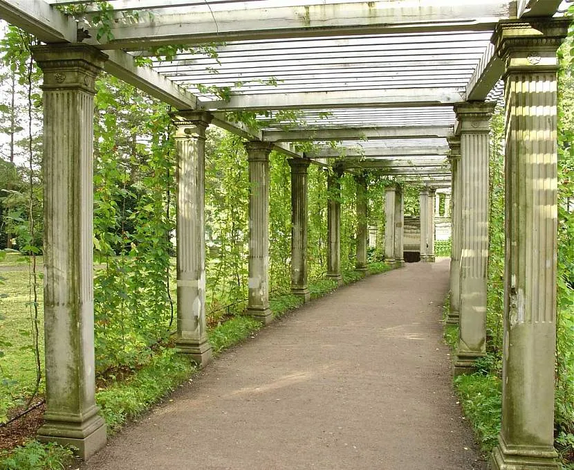 Сооружение обычно строится из двух рядов столбов, на которых крепится крыша из системы балок. Крышу и стены принято украшать декоративными вьющимися растениями. Вдоль столбов часто высаживают растения, благодаря чему сооружение обеспечит убежище от солнца в жаркие дни. Крыши, стены, покрытые растениями, станут прекрасным украшением. Сооружение обеспечит приятную тень, интимную атмосферу в саду.