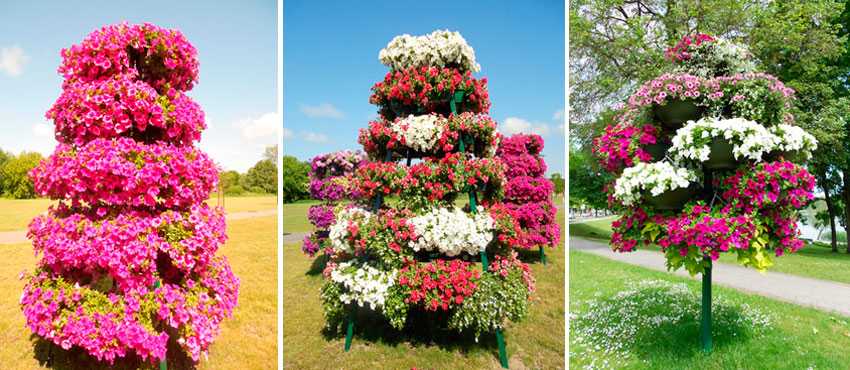 Вертикальные клумбы создают из петунии, герани, бархатцев в горшках, расположенных каскадом. Используя специальный питательный гидрогель. Гидрогель укрепляет, продолевает жизнь цветов. Можно посадить другие виды растений, например, бархатцы, создавая различные цветочные композиции.