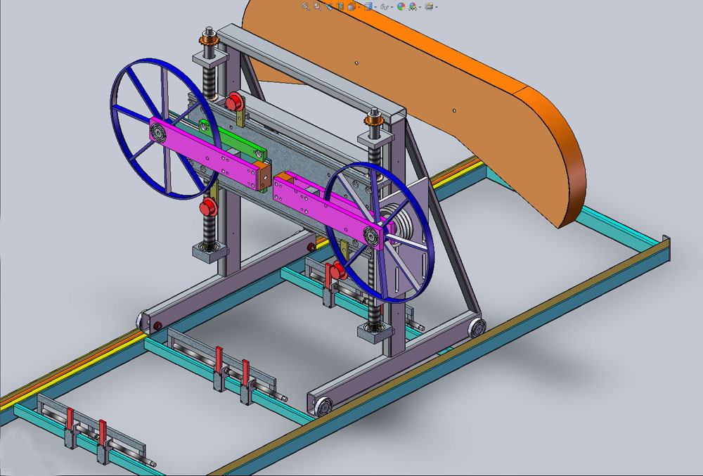 - Следующий шаг — механизм регулировки толщины доски. Тут существует два варианта. Первый как в пилораме «Logosol», поднимается бревно, а режущая часть неподвижна. Такой вариант больше подходит для распиловки небольших бревен, чтобы не наклоняться и не болела спина, быстрее производить распиловку. Для использования такого способа хорошо подойдут обычные механические домкраты, нужно смотреть чтобы высота подъема их была максимально возможной. Второй вариант это когда бревно неподвижно, а пила опускается и поднимается по линейке. Какой вариант вы будете реализовывать, нужно продумать еще на этапе создания чертежей;